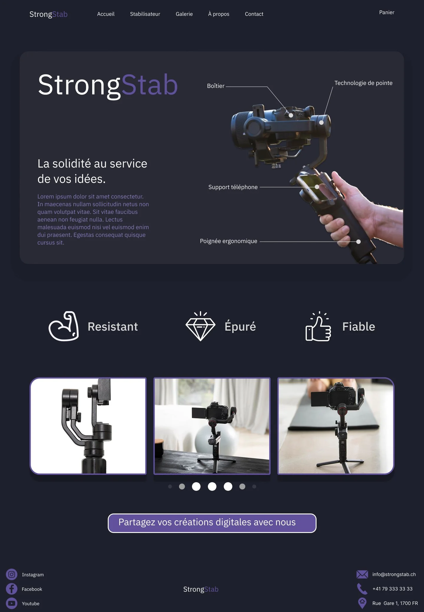J’ai réalisé cette maquette de page d'accueil avec l’outil Figma lors d’un stage découverte dans l’entreprise Thimoo. Une entreprise spécialisée dans le web design. L’exercice était de choisir entre un objet technologique ou un festival de musique et de créer un site internet sur le sujet choisi. J’ai choisi de faire ce travail sur un stabilisateur pour appareil photo. Voila le résultat du premier jour et demi de stage. Lors de la dernière demi journée de stage je devais reporter cette maquette sur elementor, un programme que j’ai trouvé moins intuitif que Figma.